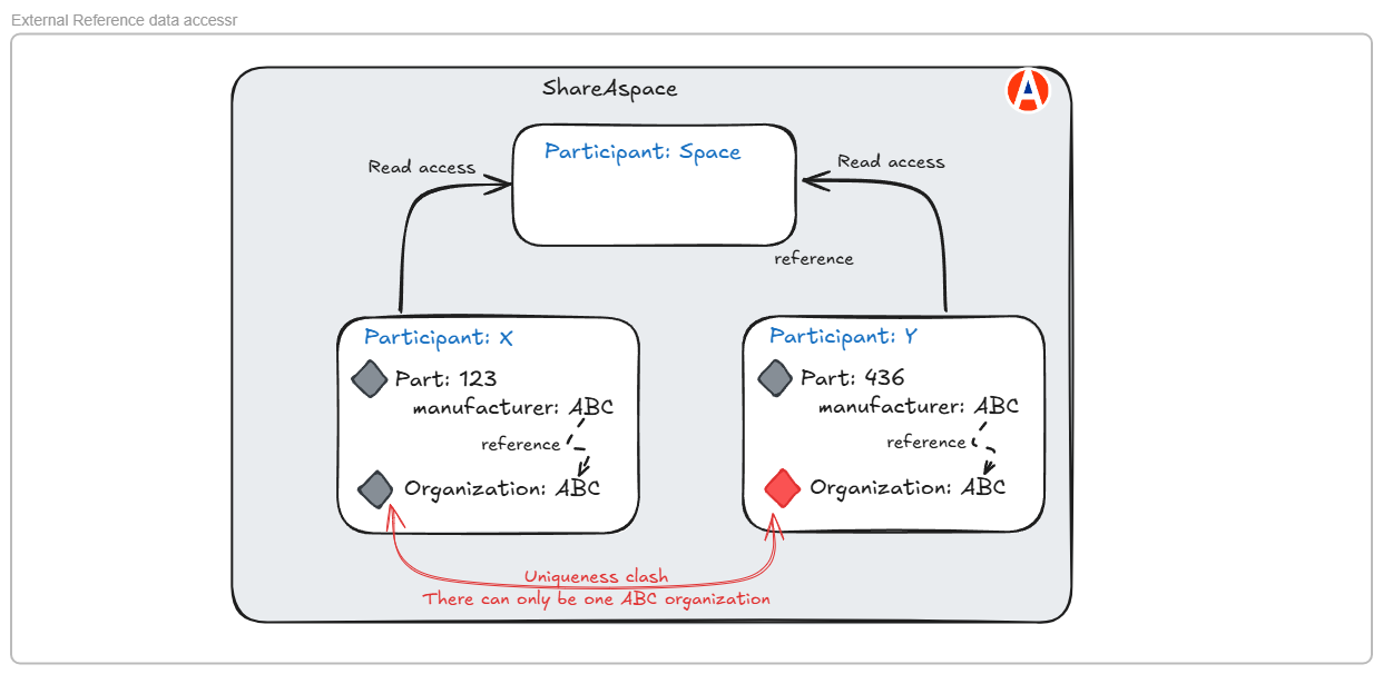 External reference data can be created by any user in any participant. A typical case where this occurs is where a supplier uploads data that includes references to reference data. For example, a parts list where each part references the part manufacturer. If the manufacturer organization does not exist in ShareAspace when the supplier imports the data, a new organization will be created. This organization will be owned by the supplier participant and therefore only visible to users who have a role in the supplier participant. This will cause uniqueness clashes if another supplier tries to import a file that references the same organization. This is illustrated below.
