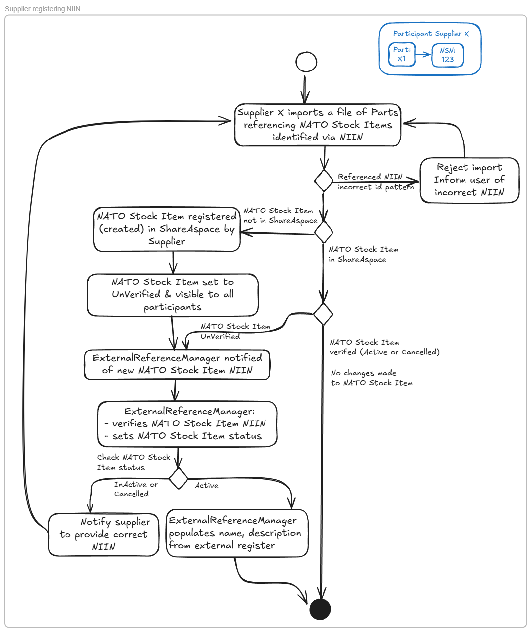 Note that it is impractical to preload ShareAspace with External Reference Data due to the volume and the need to keep it up to date. (E.g there are at least 17M NATO Stock Items registered). Hence, External Reference Data is uploaded to ShareAspace on as needed basis. Furthermore, it can be uploaded to ShareAspace by different participants in a collaboration. For example, a supplier can provide a parts list with associated NSNs and manufacturers identified by CAGE codes. The NSNs and CAGE codes may not yet be loaded to ShareAspace.